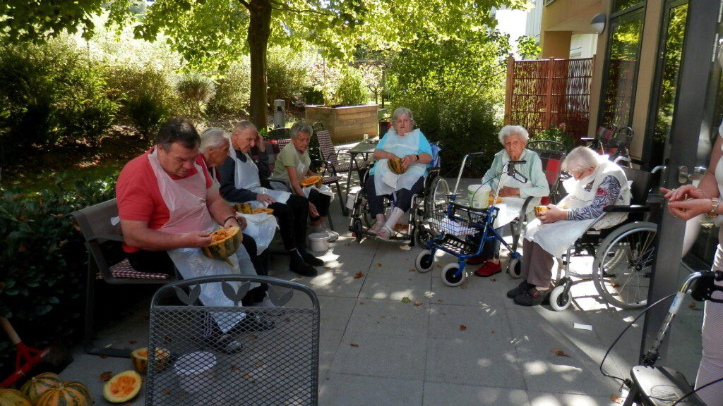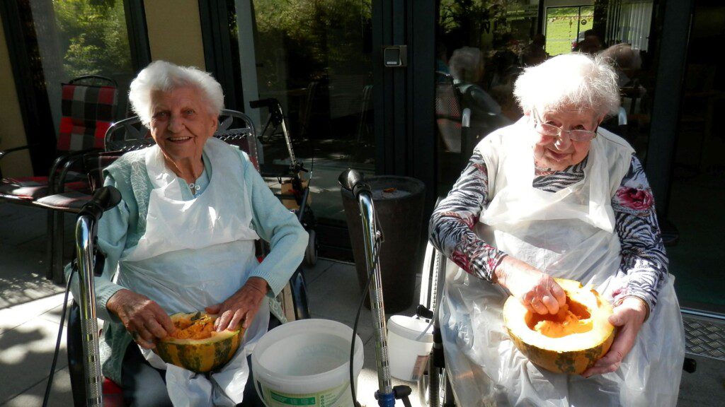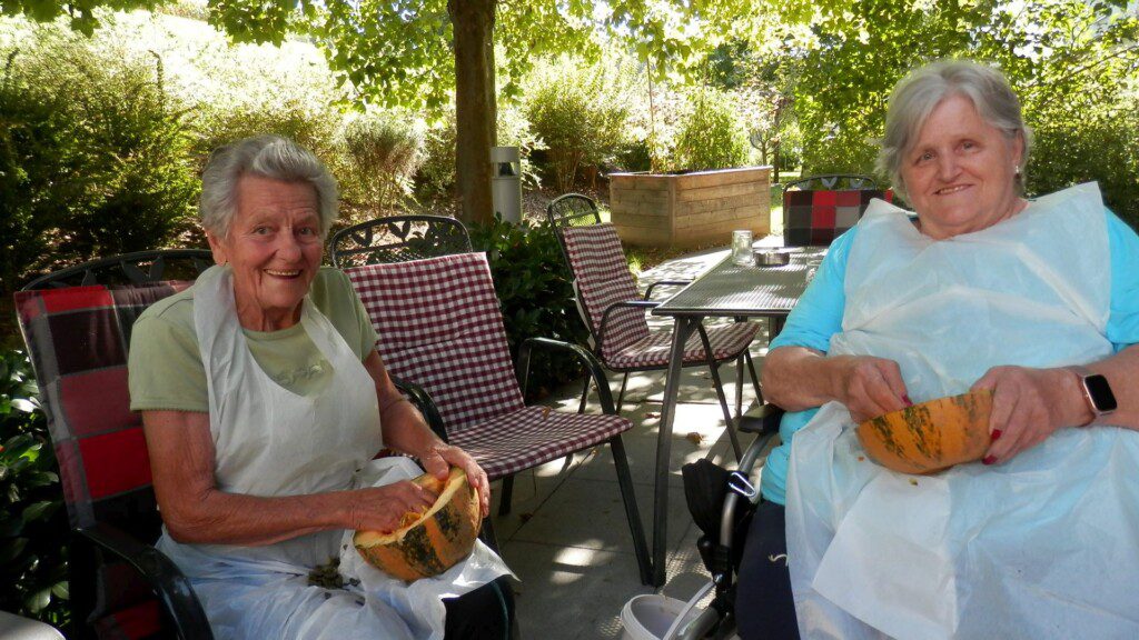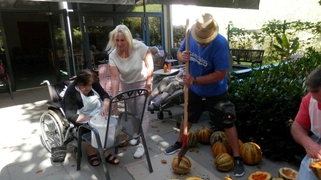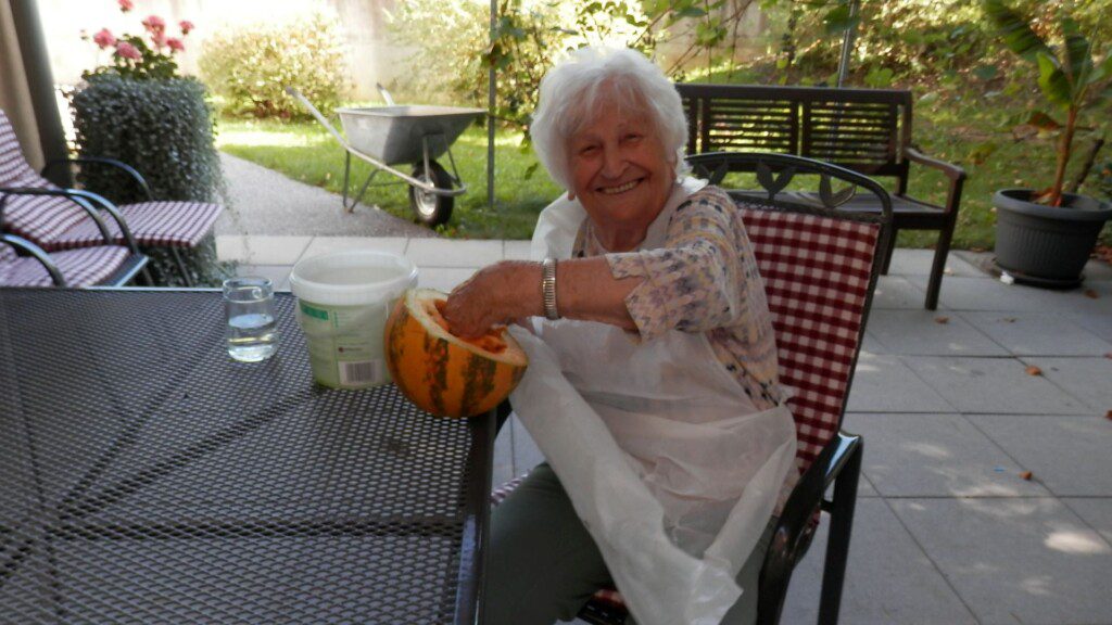 Bei den BewohnerInnen war schon am Morgen die Vorfreude auf das Kürbisputzen groß und so konnten sie es kaum erwarten am Nachmittag auf die Terrasse zu stürmen und loszulegen.