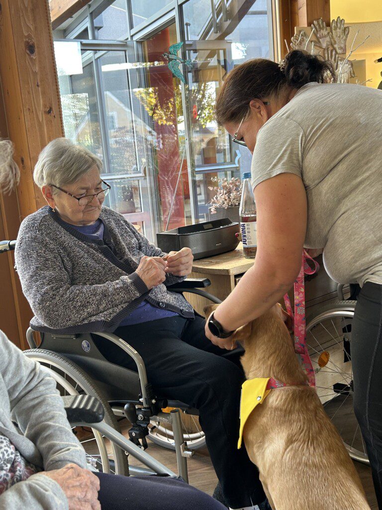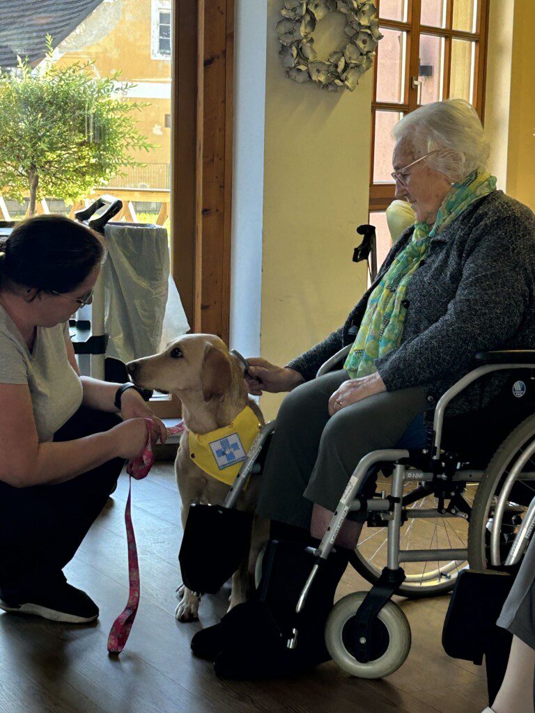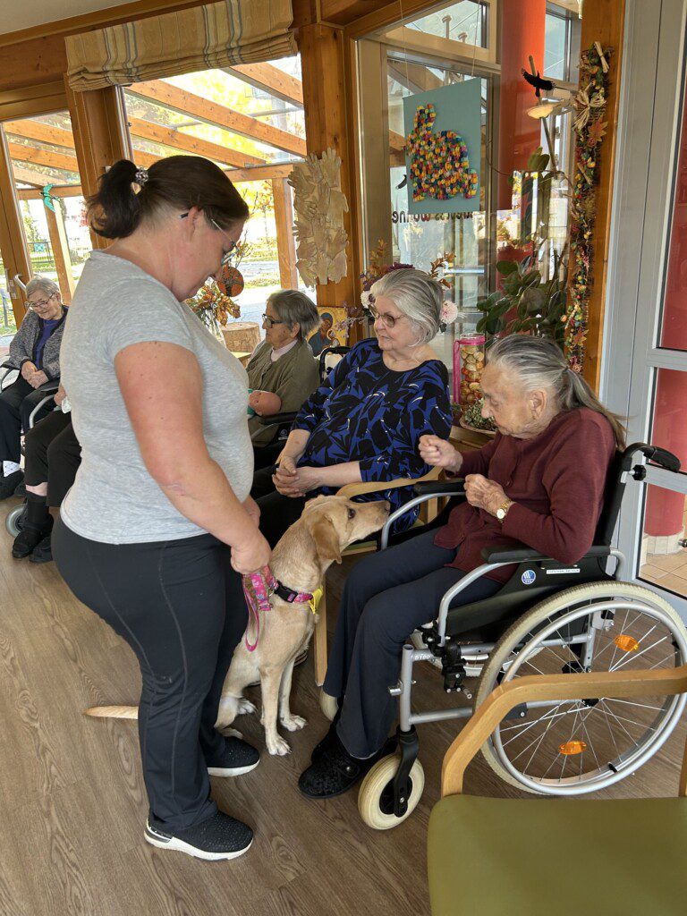 Jeder Besuch von Kimmy fördert die Freude unserer BewohnerInnen und auch deren Feinmotorik, welche durch Streicheln, Bürsten und Füttern verbessert werden kann. Stress und Angst werden reduziert und auch sozialem Rückzug kann so entgegengewirkt werden.